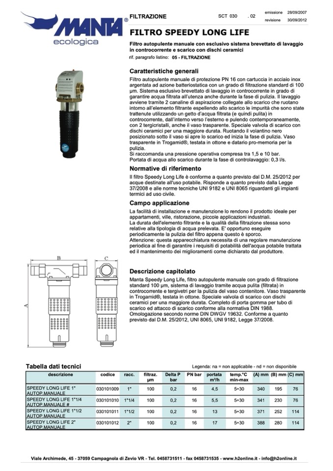 Il filtro Speedy Long Life è conforme a quanto previsto dal D.M. 25/2012 per