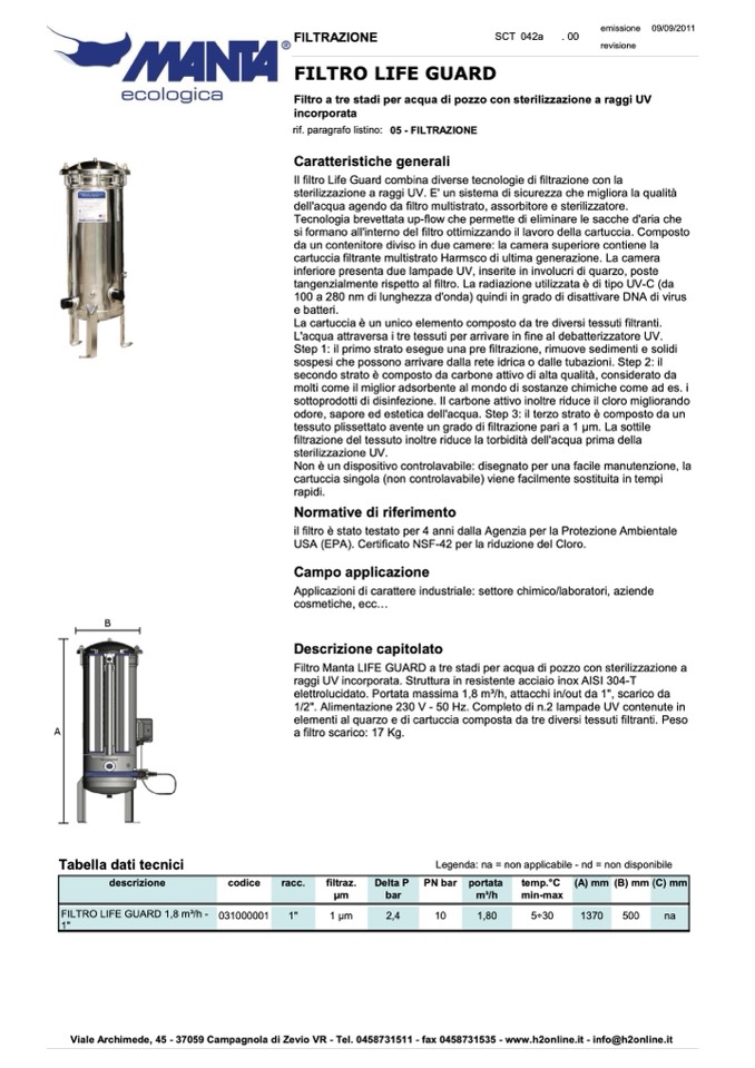 Filtro Manta LIFE GUARD a tre stadi per acqua di pozzo con sterilizzazione a