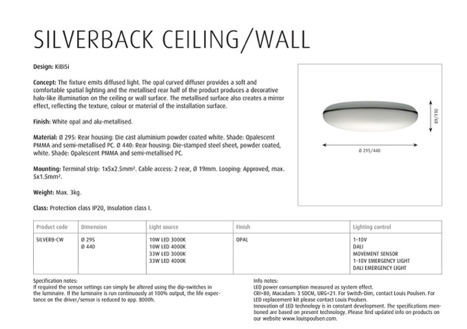 CRI>80, Macadam: 3 SDCM, URG<21. For Switch-Dim, contact Louis Poulsen. For