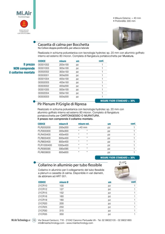 a plenum e cassette di calma. Disponibile in vari diametri,
