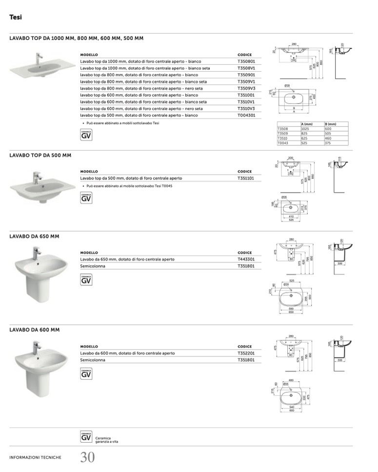 LAVABO TOP DA 1000 MM, 800 MM, 600 MM, 500 MM