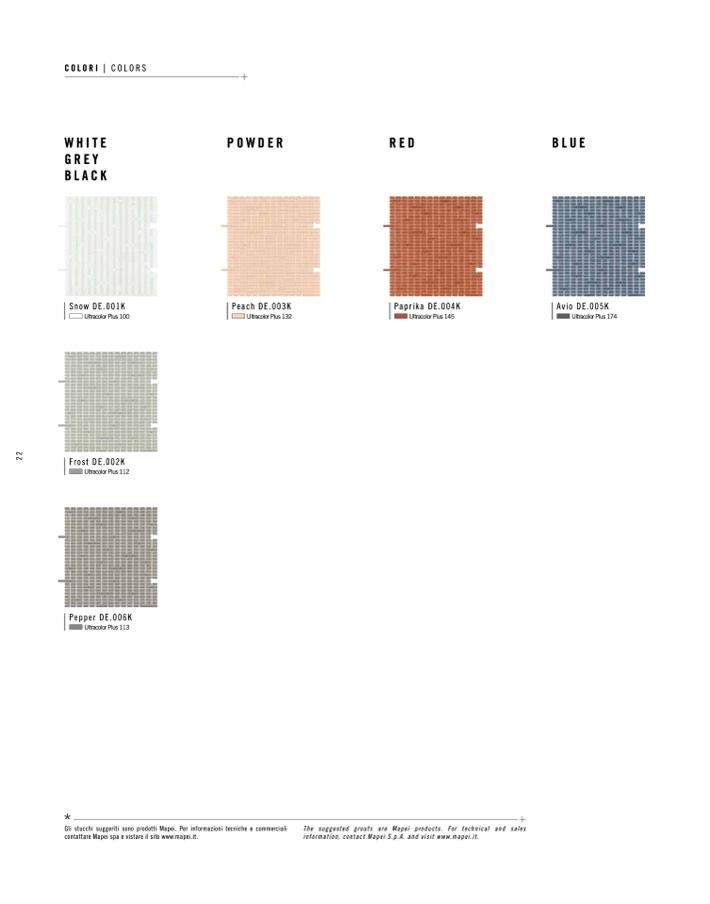 The suggested grouts are Mapei products. For technical and sales