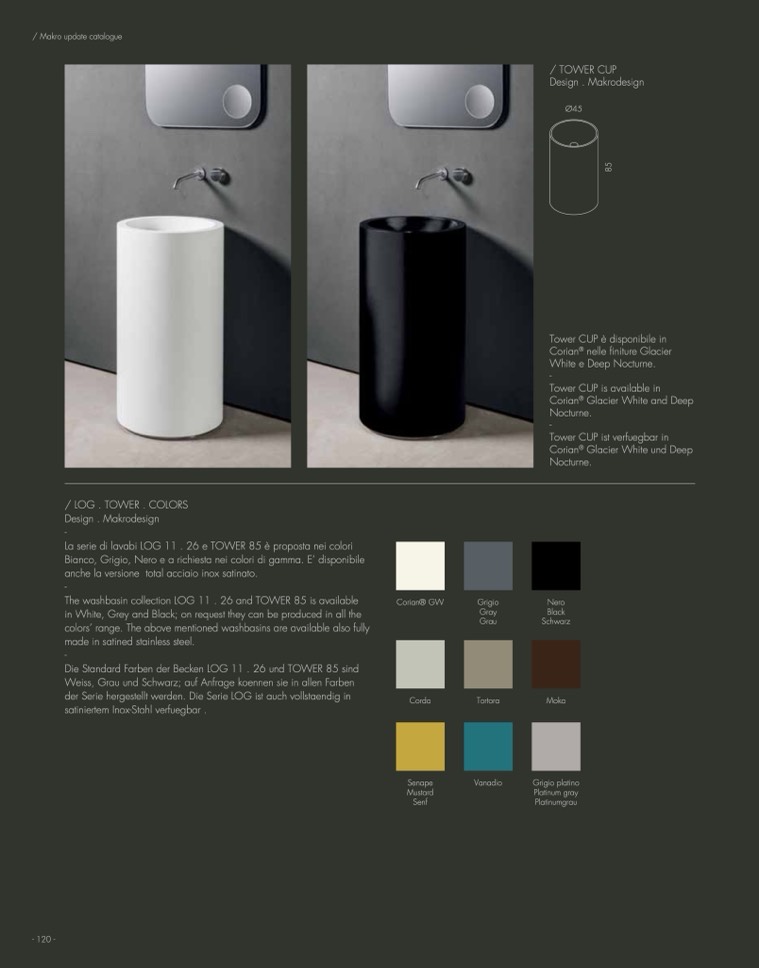 La serie di lavabi LOG 11 . 26 e TOWER 85 è proposta nei colori