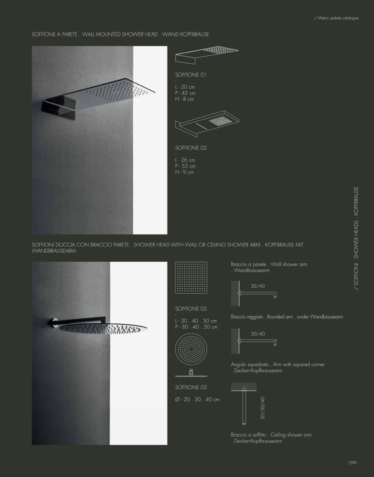 SOFFIONI DOCCIA CON BRACCIO PARETE . SHOWER HEAD WITH WALL OR CEILING SHOWER ARM . KOPFBRAUSE MIT
