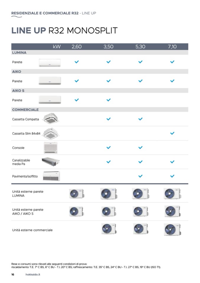 riscaldamento T.E. 7° C BS, 6° C BU - T.I. 20° C BS; raffrescamento: T.E. 35° C BS, 24° C BU - T.I. 27° C BS, 19° C BU (ISO T1).