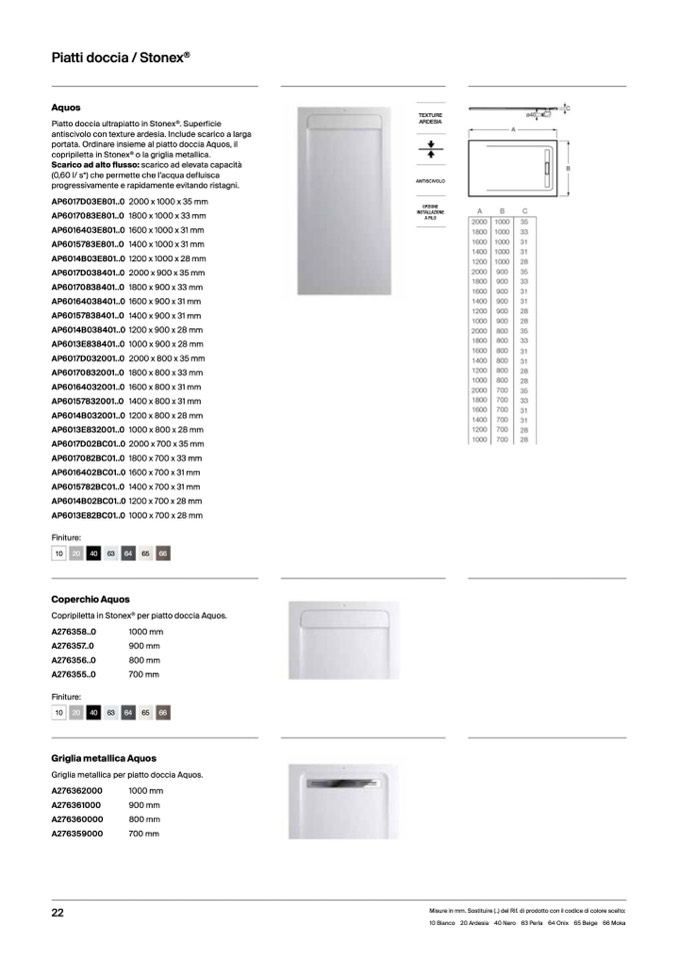 10 Bianco 20 Ardesia 40 Nero 63 Perla 64 Onix 65 Beige 66 Moka