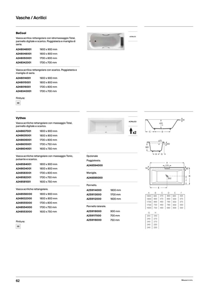 Vasca acrilica rettangolare con scarico. Poggiatesta e