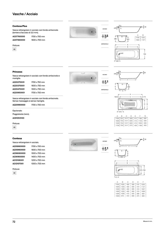 Vasca rettangolare in acciaio con fondo antiscivolo.