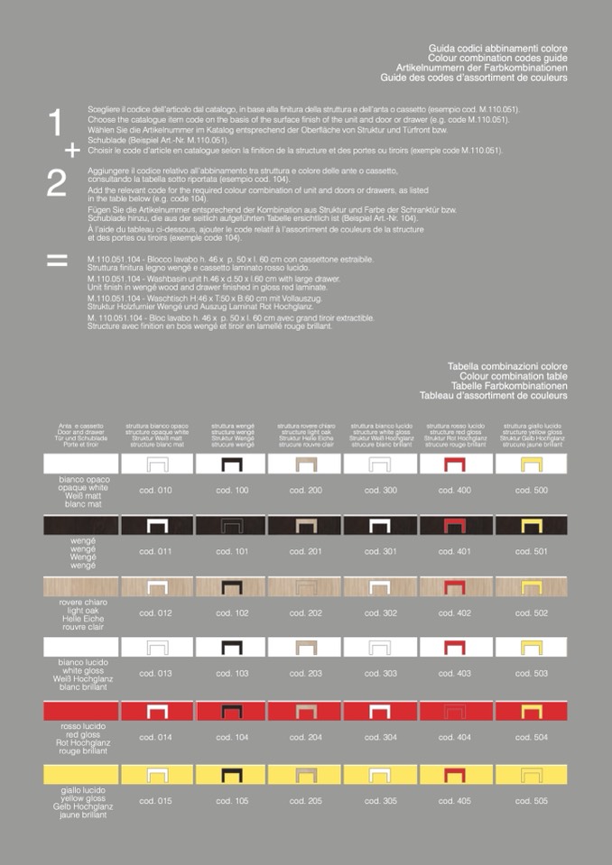 Choose the catalogue item code on the basis of the surface finish of the unit and door or drawer (e.g. code M.110.051).