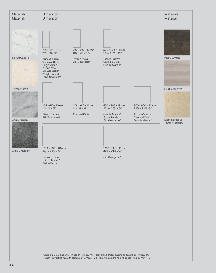*Crema d'Orcia has a thickness of 14 mm / 9/16" | Travertino chiaro ha uno spessore di 14 mm / 9/16"