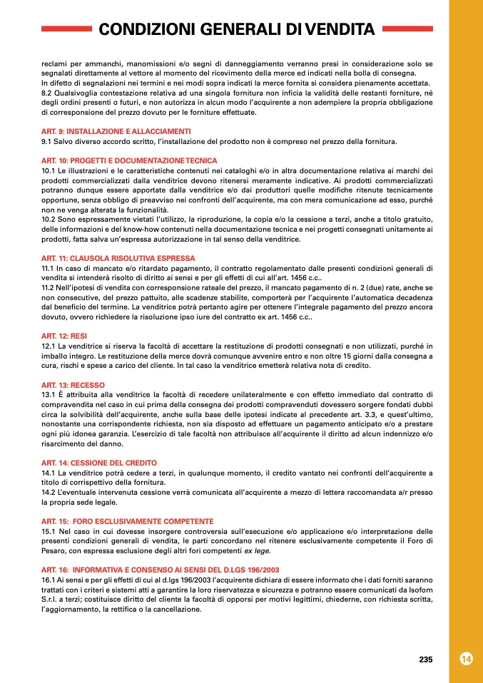 16.1 Ai sensi e per gli effetti di cui al d.lgs 196/2003 l’acquirente dichiara di essere informato che i dati forniti saranno