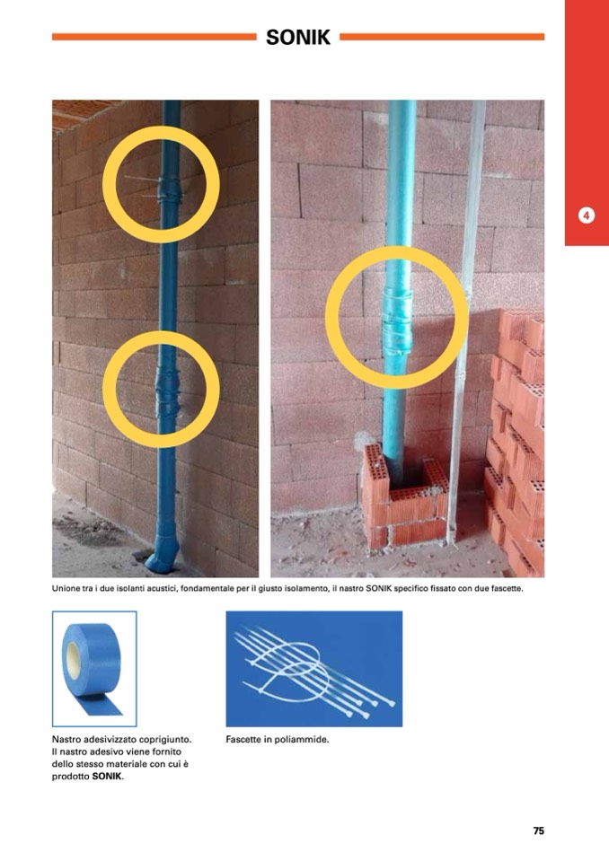 Unione tra i due isolanti acustici, fondamentale per il giusto isolamento, il nastro SONIK specifico fissato con due fascette.