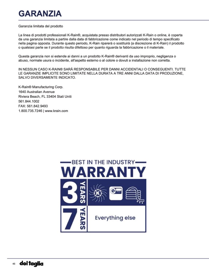 nella pagina opposta. Durante questo periodo, K-Rain riparerà o sostituirà (a discrezione di K-Rain) il prodotto