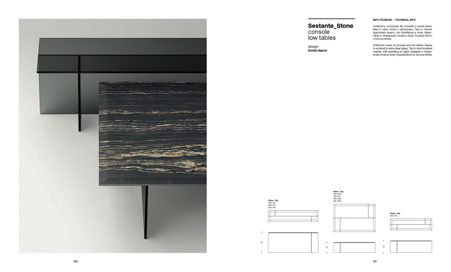 Basi in vetro fumé o extrachiaro. Top in marmo