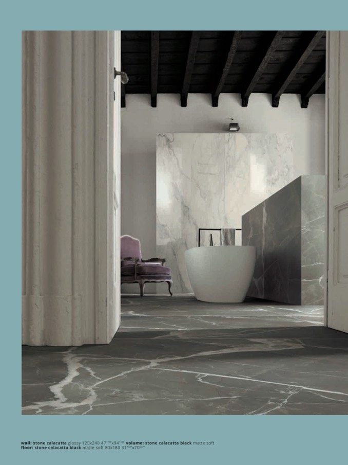 wall: stone calacatta glossy 120x240 471/4”x941/2” volume: stone calacatta black matte sof