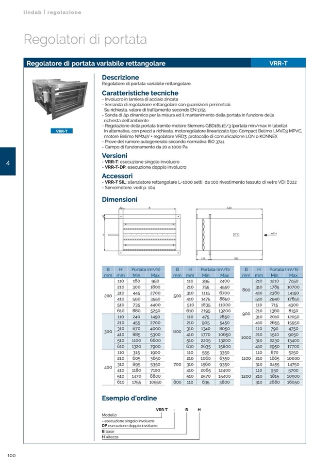 - Regolazione della portata tramite motore Siemens GBD181.1E/3 (portata min/max in tabella)