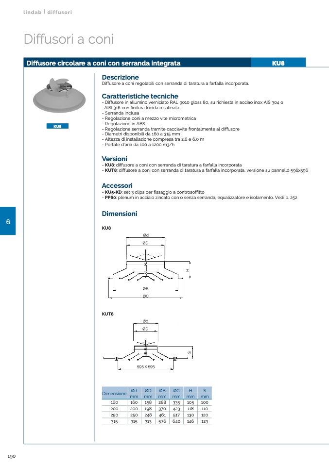 - KUT8: diffusore a coni con serranda di taratura a farfalla incorporata, versione su pannello 596x596
