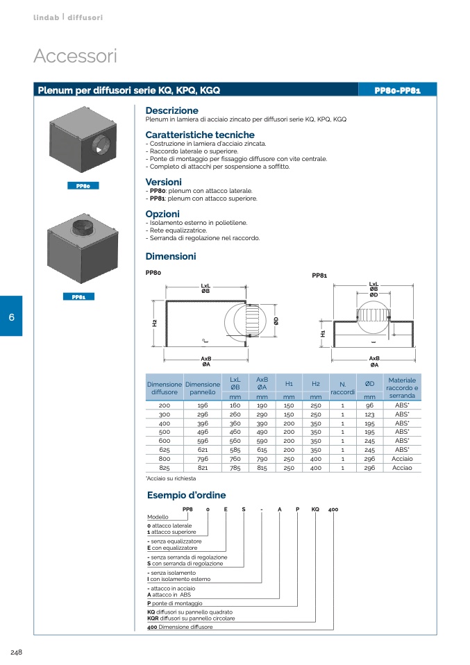 Plenum in lamiera di acciaio zincato per diffusori serie KQ, KPQ, KGQ