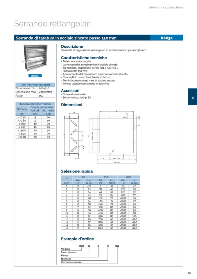 Serrande di regolazione rettangolari in acciaio zincato, passo 150 mm.