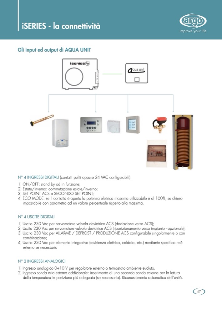 4) Uscita 230 Vac per elemento integrativo (resistenza elettrica, caldaia, etc.) mediante specifico relè
