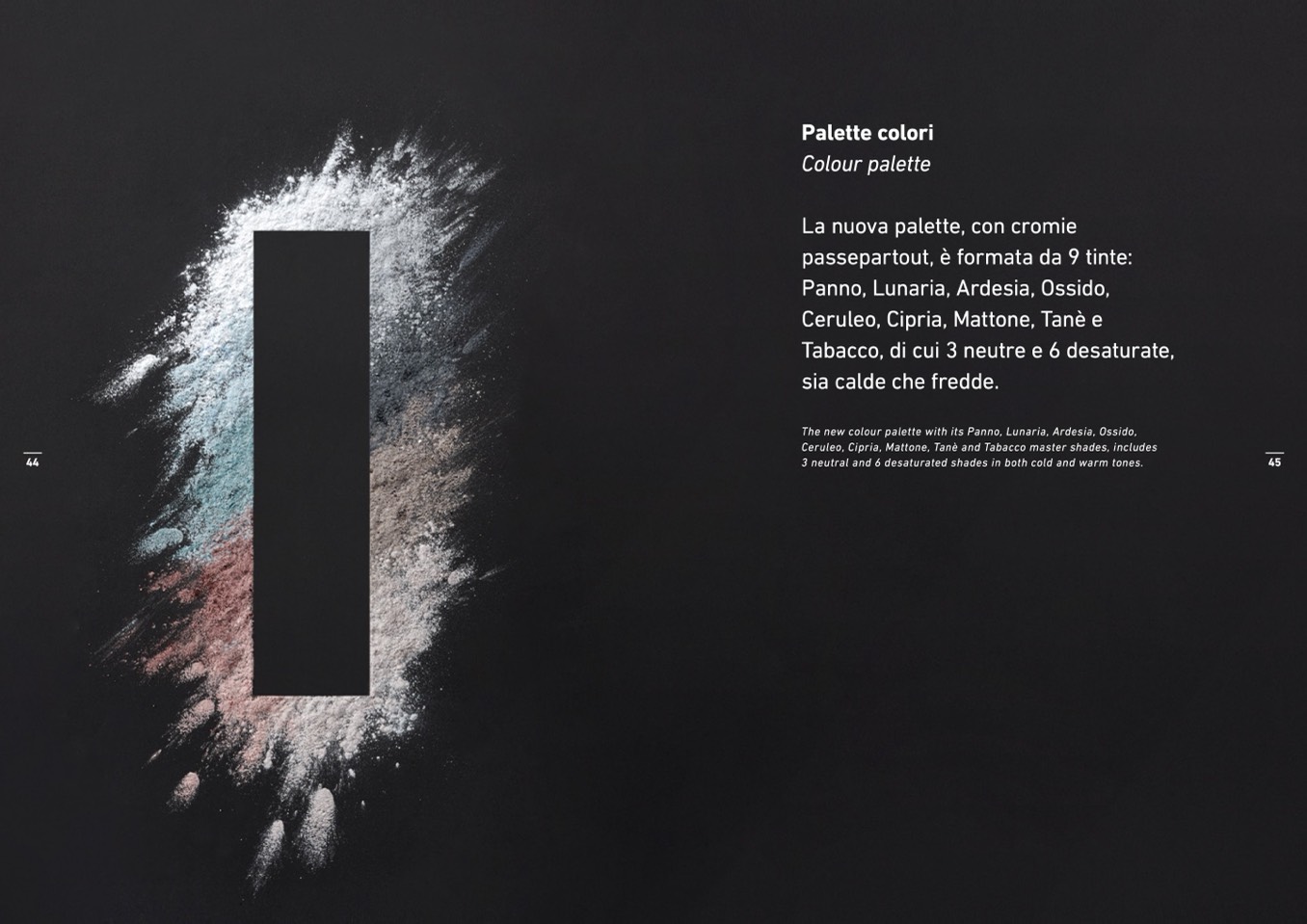 The new colour palette with its Panno, Lunaria, Ardesia, Ossido,