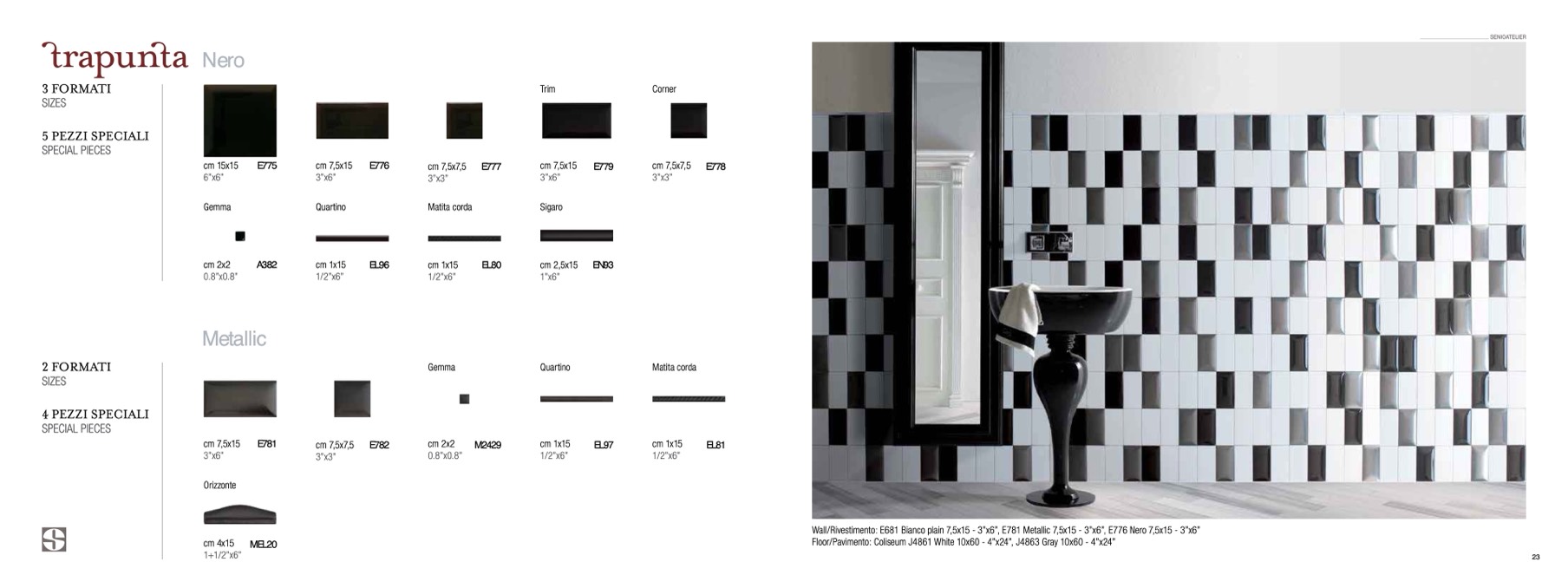 Wall/Rivestimento: E681 Bianco plain 7,5x15 - 3”x6”, E781 Metallic 7,5x15 - 3”x6”, E776 Nero 7,5x15 - 3”x6”