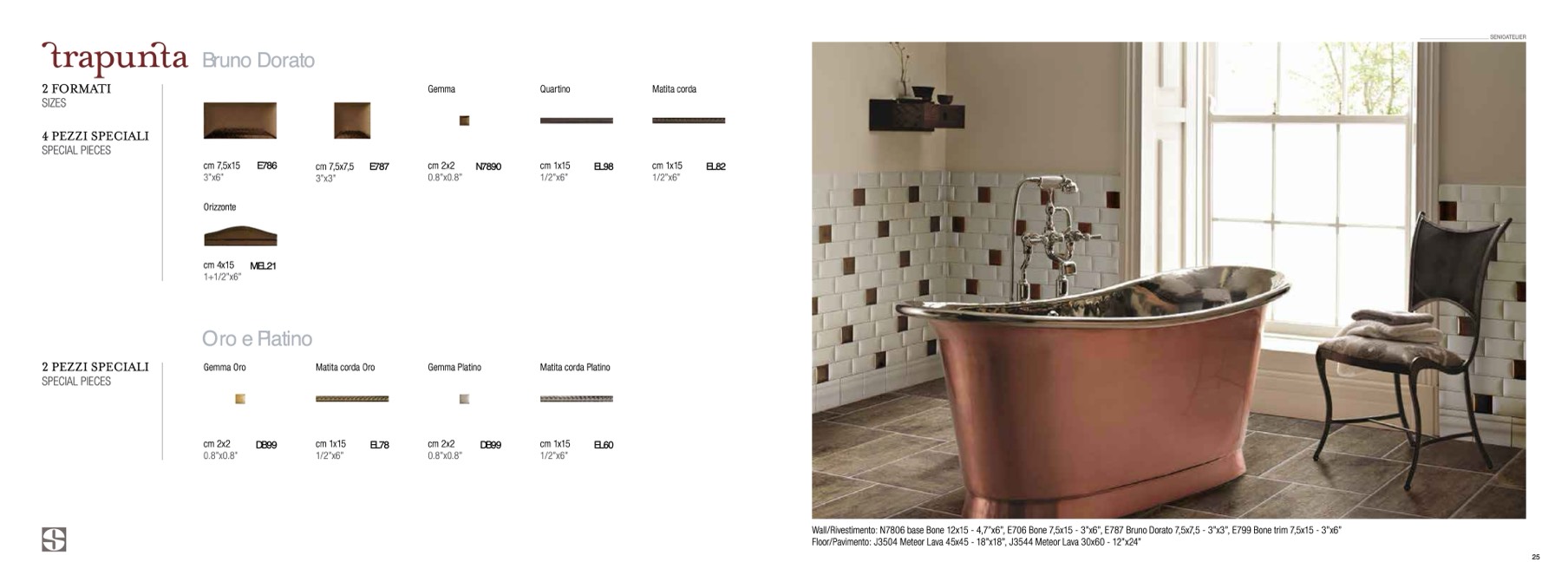 Wall/Rivestimento: N7806 base Bone 12x15 - 4,7”x6”, E706 Bone 7,5x15 - 3”x6”, E787 Bruno Dorato 7,5x7,5 - 3”x3”, E799 Bone trim 7,5x15 - 3”x6”