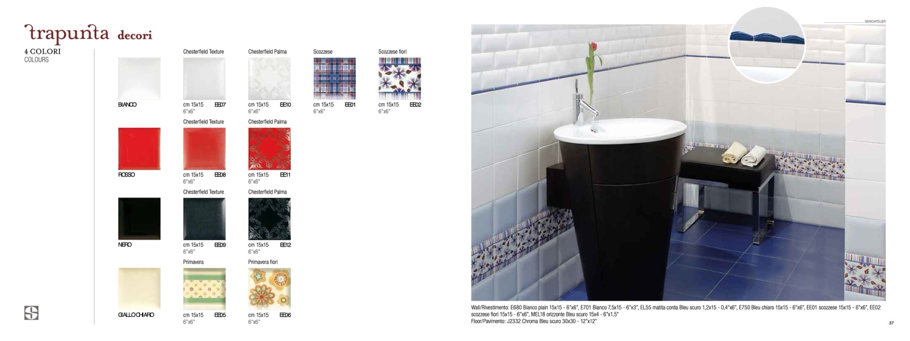 Wall/Rivestimento: E680 Bianco plain 15x15 - 6”x6”, E701 Bianco 7,5x15 - 6”x3”, EL55 matita corda Bleu scuro 1,2x15 - 0,4”x6”, E750 Bleu chiaro 15x15 - 6”x6”, EE01 scozzese 15x15 - 6”x6”, EE02