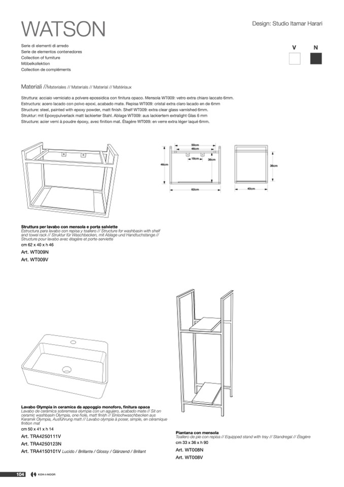 Structure: steel, painted with epoxy powder, matt finish. Shelf WT009: extra clear glass varnished 6mm.