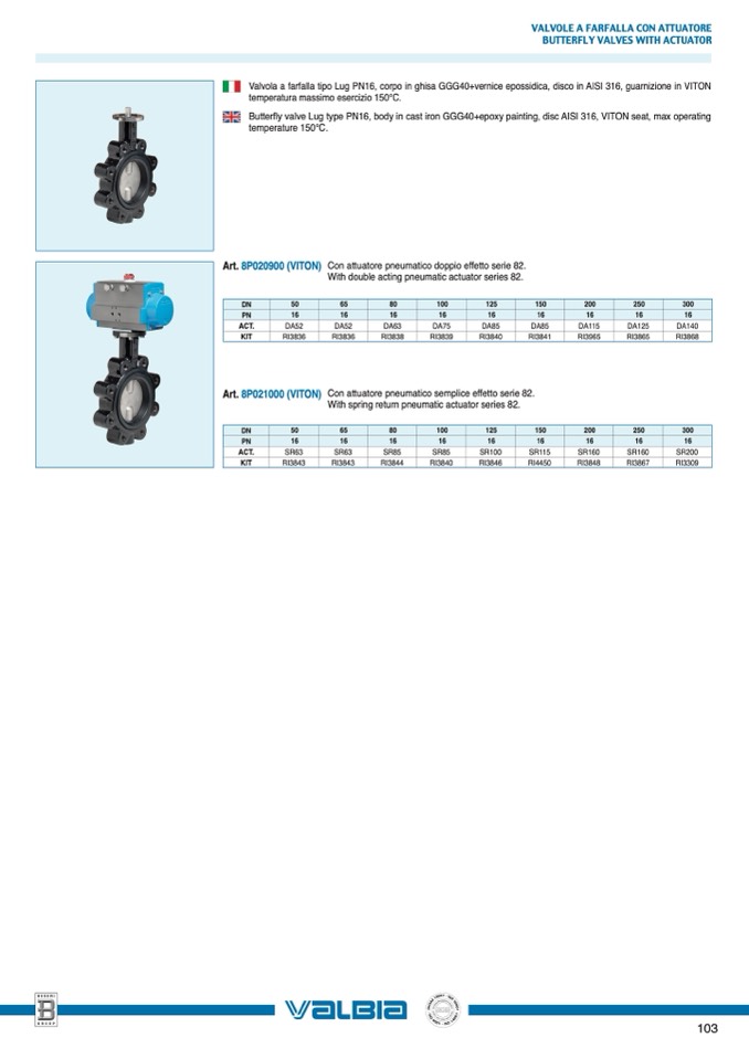 Art. 8P021000 (VITON) Con attuatore pneumatico semplice effetto serie 82.