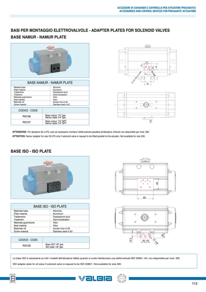 La base ISO è necessaria su tutti i modelli dell’attuatore Valbia quando si vuole interfacciare una elettrovalvola ISO 5599/1. Art. non disponibile per mod. 330.