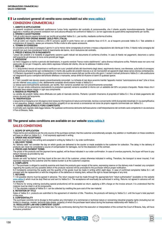Le condizioni generali di vendita sono consultabili sul sito www.valbia.it