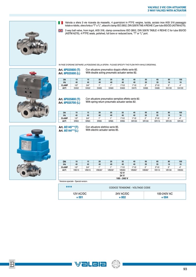 totale e ridotto, sfera forta a “T” o “L”, attacchi clamp ISO 2852, DIN 32676 TAB.4 REIHE C per tubo BS/OD (ASTM A270).