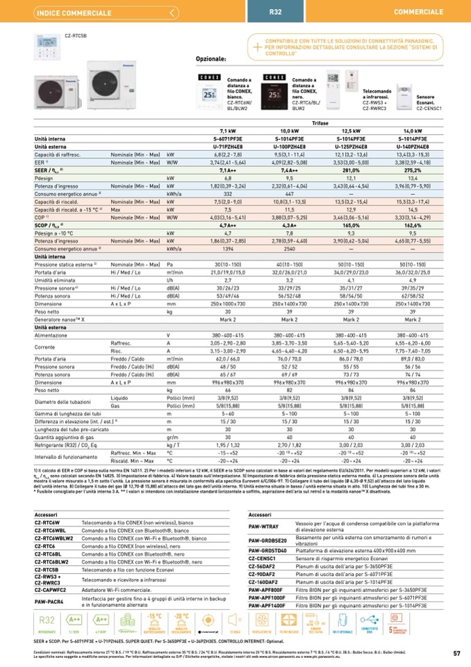 SEER e SCOP: Per S-6071PF3E + U-71PZH4E5. SUPER QUIET: Per S-3650PF3E + U-36PZH3E5. CONTROLLO INTERNET: Optional.