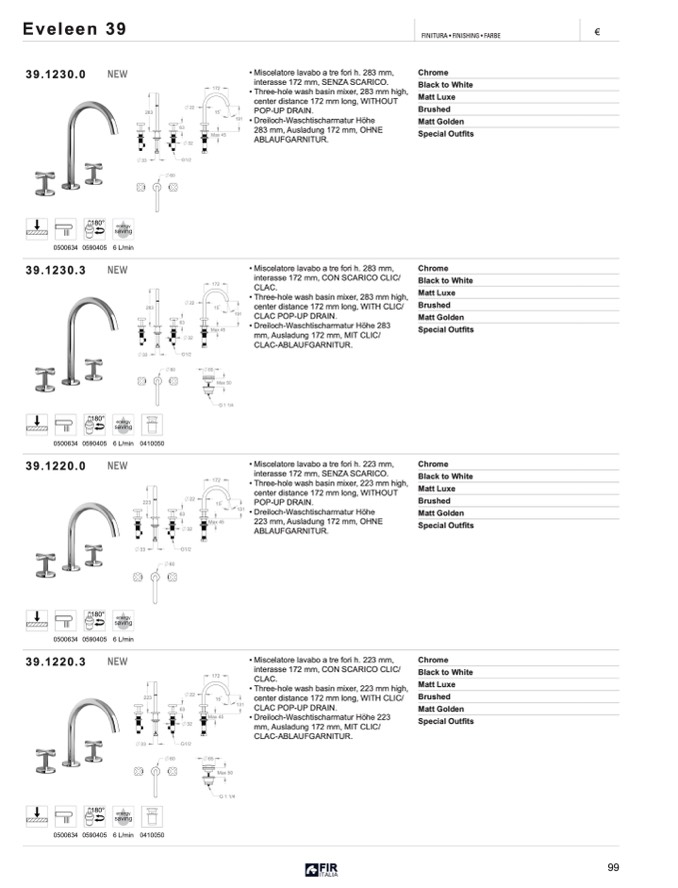 • Miscelatore lavabo a tre fori h. 223 mm,