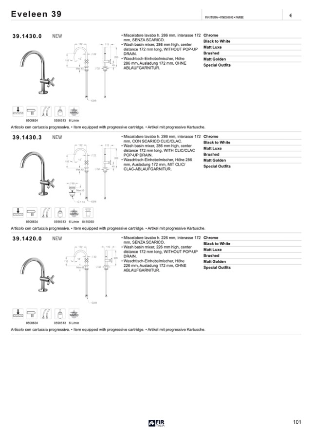• Miscelatore lavabo h. 286 mm, interasse 172