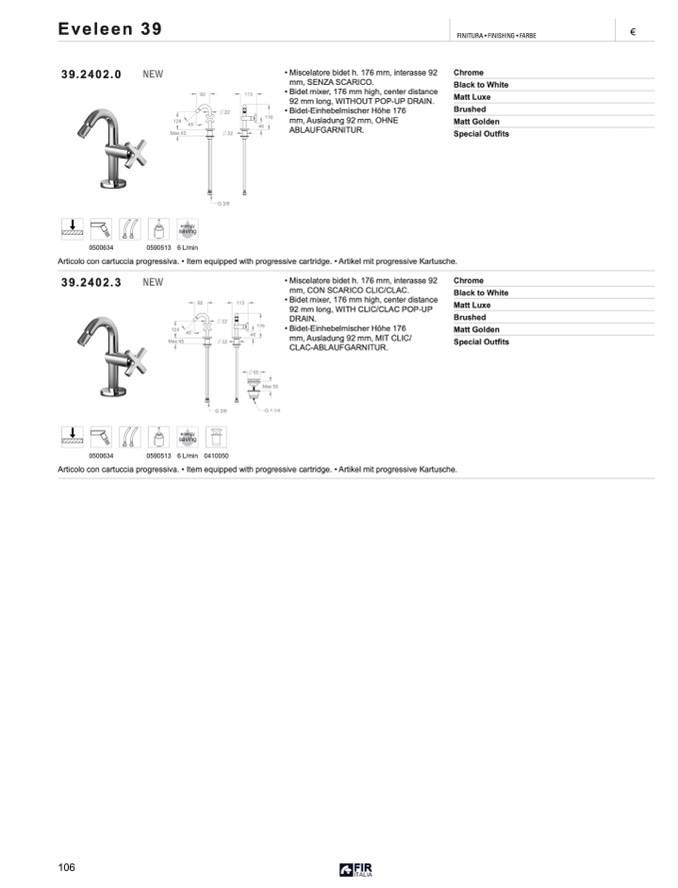 • Miscelatore bidet h. 176 mm, interasse 92