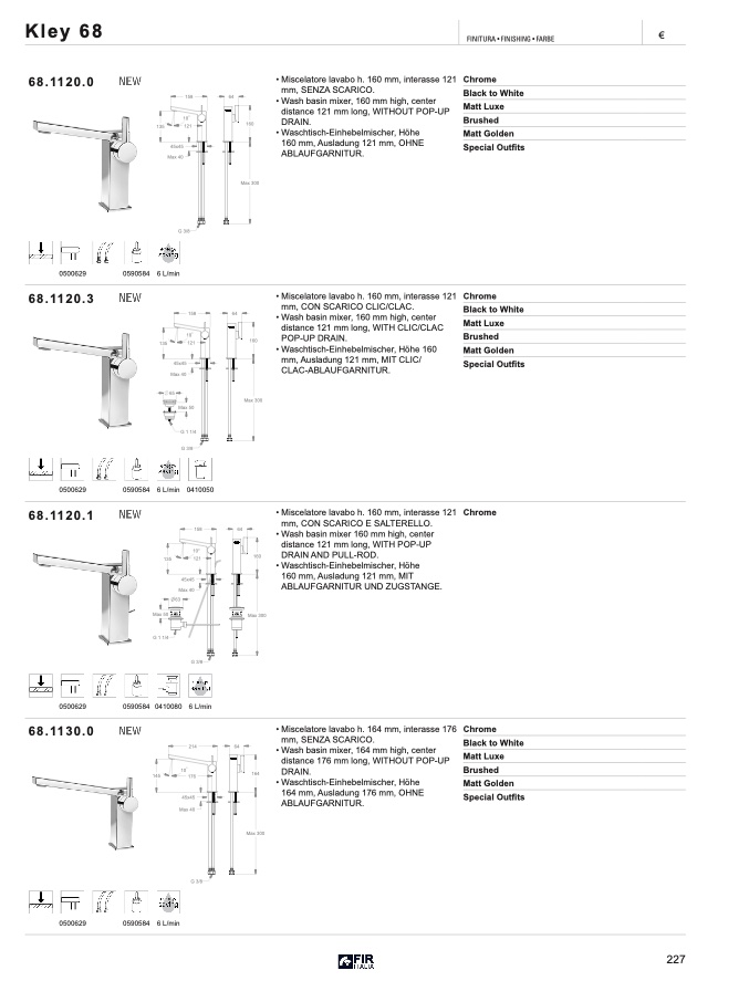 • Miscelatore lavabo h. 160 mm, interasse 121