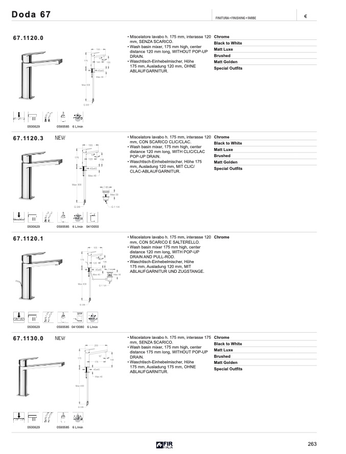 • Miscelatore lavabo h. 175 mm, interasse 120