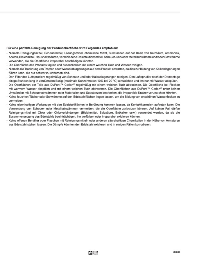 - Keine eisenhaltigen Werkzeuge mit den Edelstahlflächen in Berührung kommen lassen, da Kontaktkorrosion auftreten kann. Die