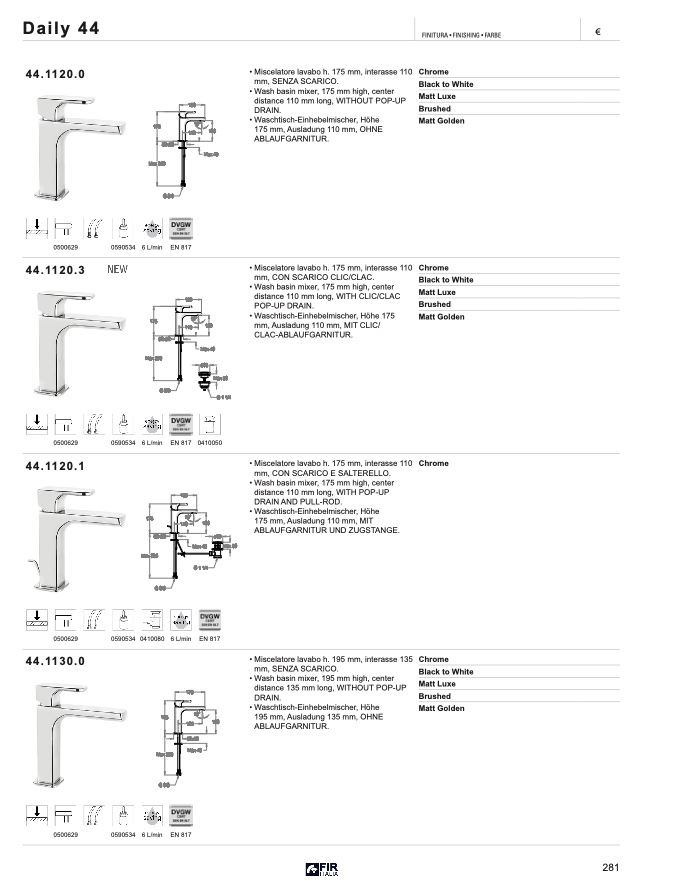 • Miscelatore lavabo h. 175 mm, interasse 110