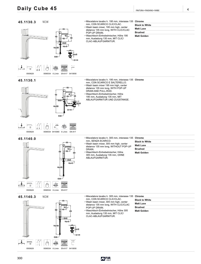 • Miscelatore lavabo h. 305 mm, interasse 135