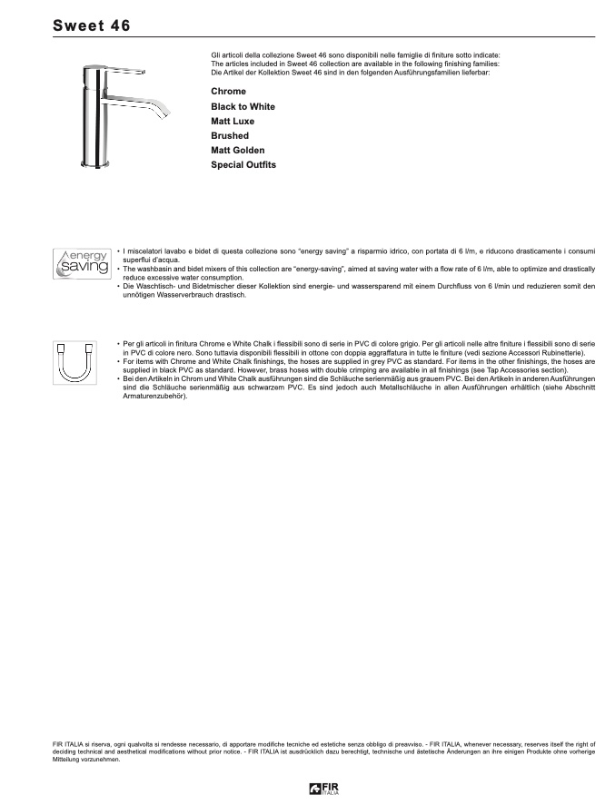 deciding technical and aesthetical modifications without prior notice. - FIR ITALIA ist ausdrücklich dazu berechtigt, technische und ästetische Änderungen an ihre einigen Produkte ohne vorherige