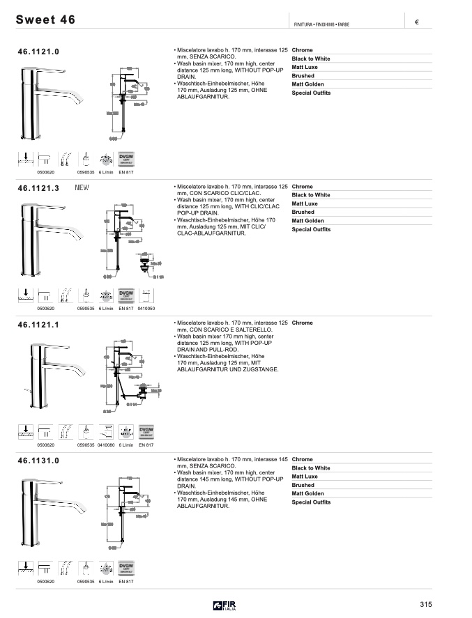 • Miscelatore lavabo h. 170 mm, interasse 145