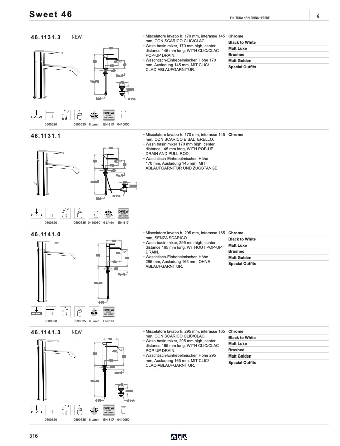 • Miscelatore lavabo h. 170 mm, interasse 145