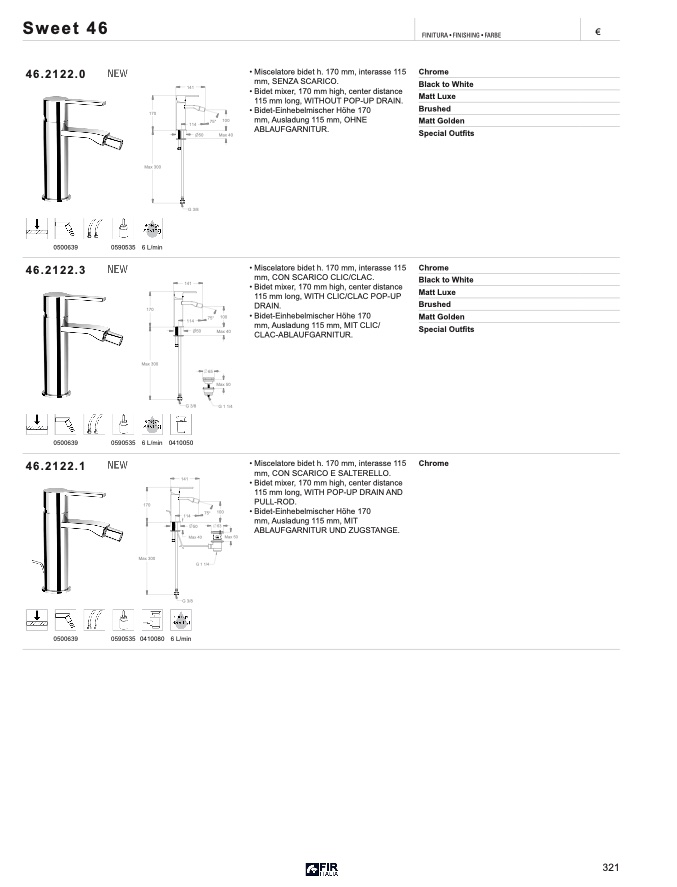 Miscelatore bidet h. 170 mm, interasse 115