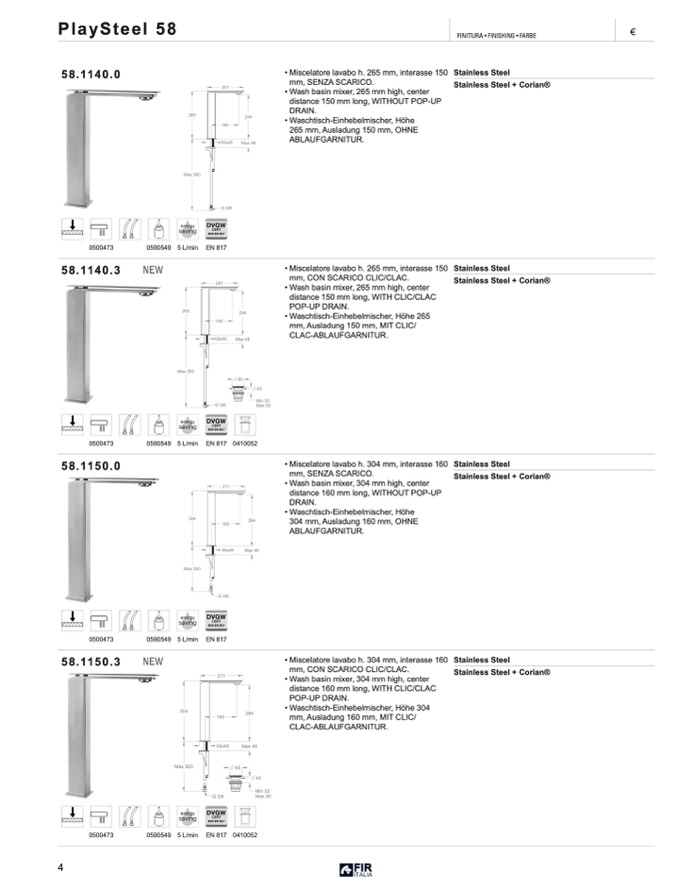 • Miscelatore lavabo h. 265 mm, interasse 150