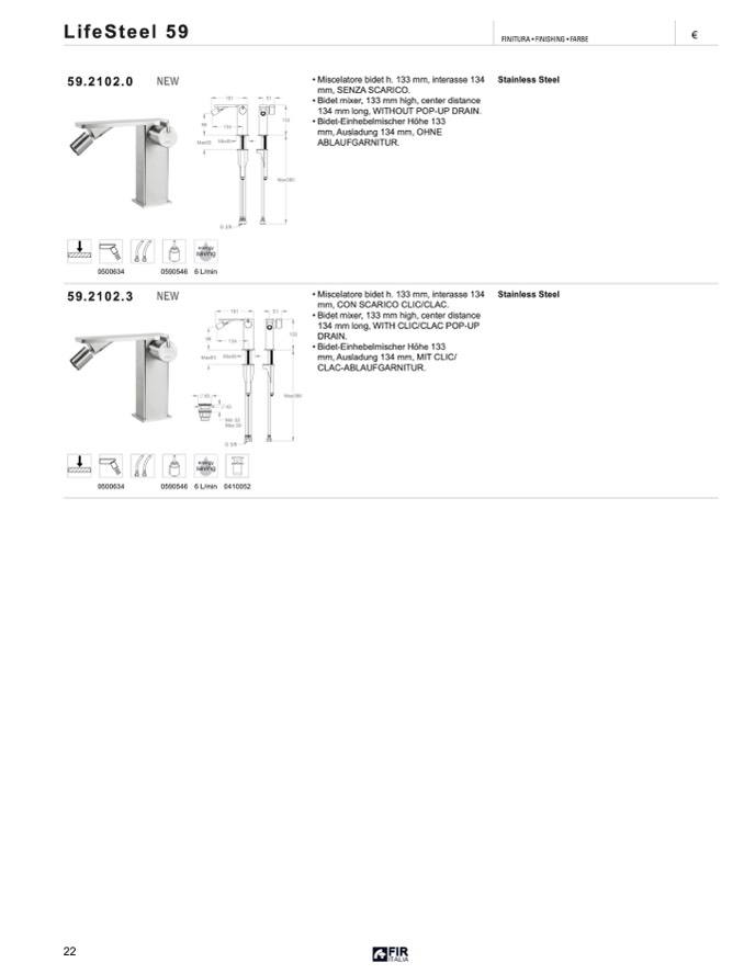 • Miscelatore bidet h. 133 mm, interasse 134