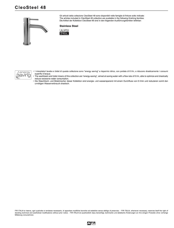 FIR ITALIA si riserva, ogni qualvolta si rendesse necessario, di apportare modifiche tecniche ed estetiche senza obbligo di preavviso. - FIR ITALIA, whenever necessary, reserves itself the right of