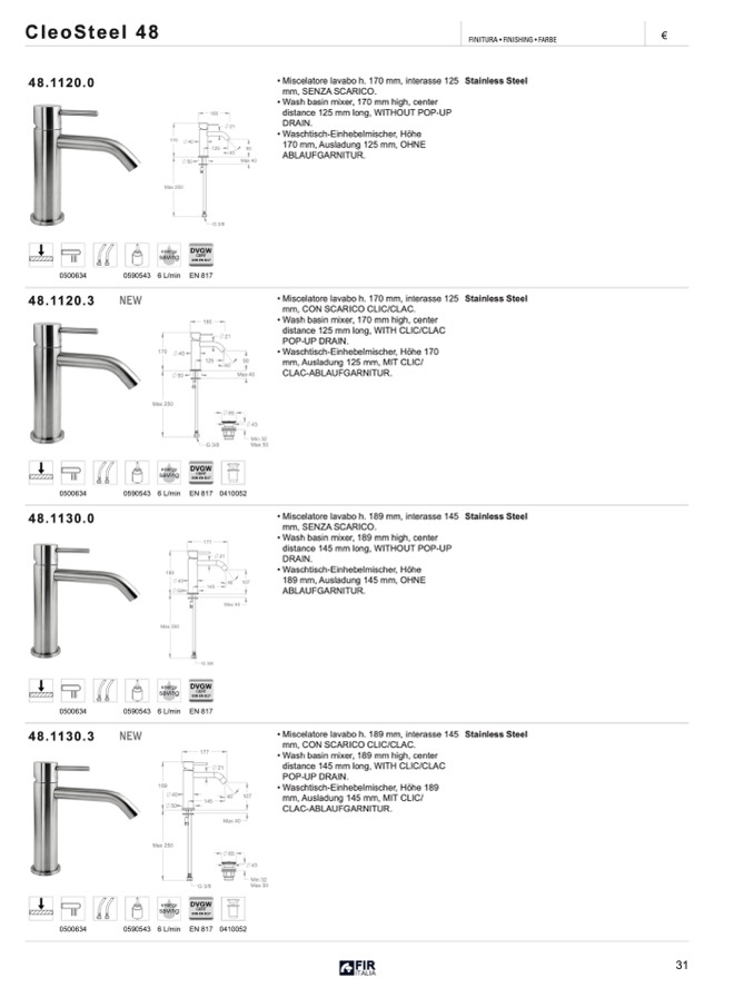 • Miscelatore lavabo h. 170 mm, interasse 125